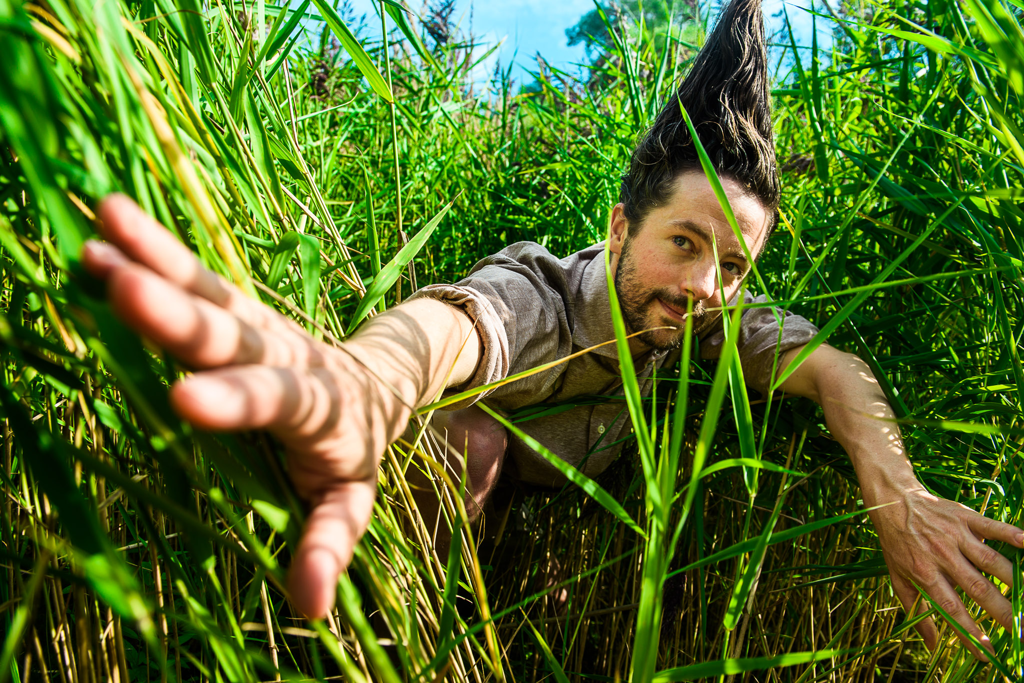 Kriblende, krablende, klukkende græsstrå svajer rundt om publikum i Græsgrøn. Som var vi skrumpet ind og omringet af en verden, der normalt kun kilder vores fødder på en varm sommerdag. Her er vi på opdagelse blandt stråene, der gemmer på uendelige oplevelser og muligheder. Som iderige opdagelsesrejsende undersøger en danser og en musiker det levende landskab i det hvislende græs. Sammen fordyber vi os i plænens hidtil ubemærkede underverden af nye klange og melodier skabt af bevægelse og lyd. Musik får plads og tid til at opstå ud af alt det grønne. Dugtunge strå og små pletter af sol, insekters svirren og vindens hvisken former et sanseligt univers af bevægelse og lyd, som hylder hverdagens små mirakler.